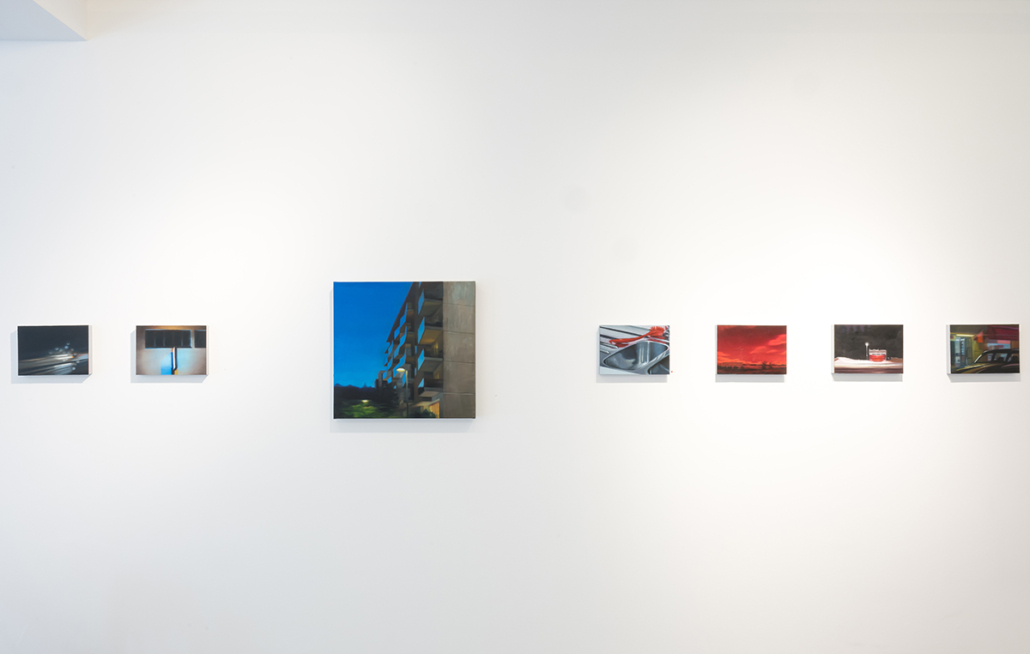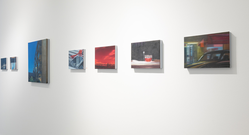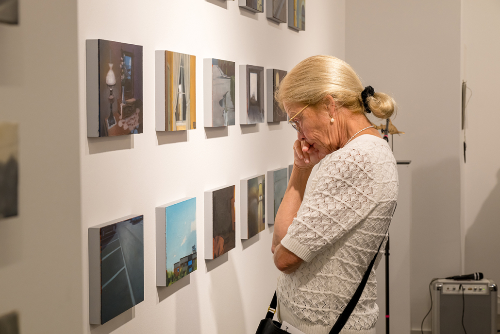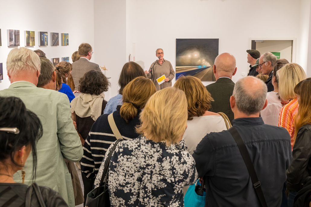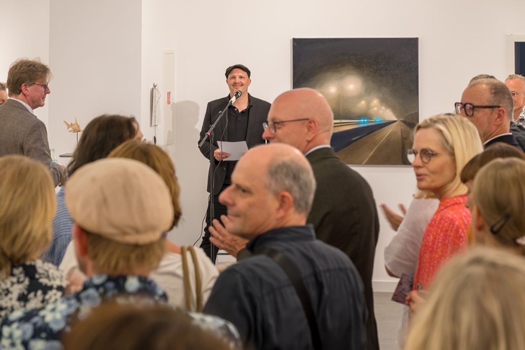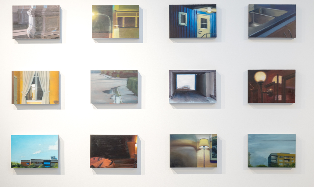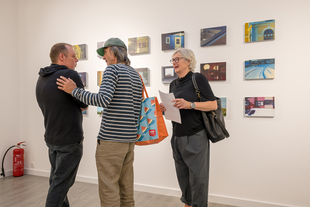 Mikael Jacobsson, geboren 1972 in Schweden, beschäftigt sich in seinem Werk mit der Flüchtigkeit des Moments, mit jener Unschärfe, die durch Bewegung entsteht. Seine Bilder zeigen Häuser, Straßen, Bäume, Landschaften, Innenräume und Detailaufnahmen, hin und wieder auch ein Stück Himmel. Alles wirkt leicht verschwommen, wie eine vorbeiziehende Szenerie, betrachtet durch das Fenster eines fahrenden Autos oder Zuges. Jacobsson gelingt es, diesen flüchtigen Moment in all seiner Intensität festzuhalten. Fast scheint man ihn greifen zu können. Seine Werke sind menschenleer, doch keineswegs leer oder einsam: Die Häuser wirken bewohnt, die Felder bestellt, leuchtende Fenster und gepflegte Gärten zeugen davon. Was sich dort genau abspielt, bleibt verborgen – geheimnisvoll und still. Sein künstlerischer Ansatz basiert auf fotografischen Vorlagen. Motive, die im Alltag oft übersehen werden, verwandelt er in poetische Bildräume. In der Übersetzung in die Malerei tritt die Realität zurück. Es entsteht ein Zustand zwischen Erinnerung und Wahrnehmung, zwischen Anwesenheit und Abwesenheit.